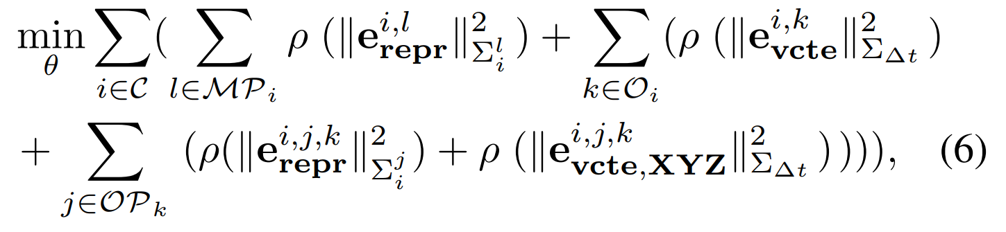 其中ρ被定义为鲁棒性增强的Huber代价函数,并且该代价函数通过减少离群对应对整体匹配效果的影响程度来提升整体匹配质量。该代价函数中的协方差矩阵Σ取决于相机i观测点l和j的关键点的比例;而这些额外误差项则受物体两次连续观测之间的时间间隔影响,在这种情况下时间间隔越长会导致对恒定速度假设下的不确定性度量更加敏感。我们需要最小化的一组参数包括这些因素的相关权值设置。