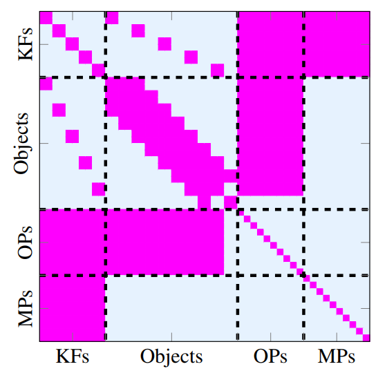 图5:由五个关键帧(KF)、一个拥有十个目标点(OP)和十个静态地图点(MP)构成的Hessian矩阵。