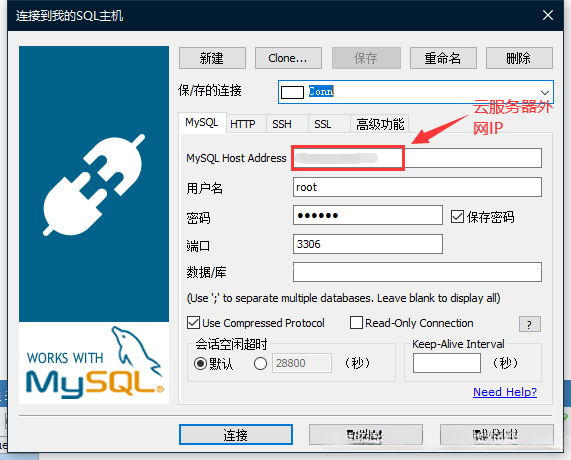 请设置云服务器的外网IP;然后配置MySQL数据库账号,并输入账号名、密码以及开放的端口号;最后确保能够成功建立连接