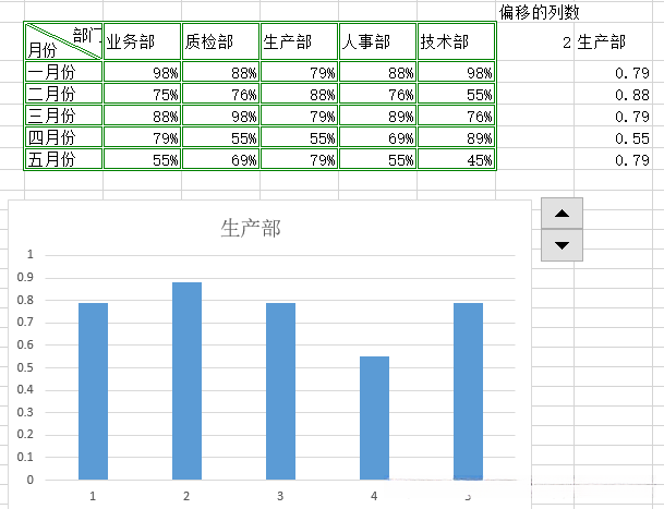 对于offset函数,在设置数据偏移时需要注意的关键点在于:要使业务部这一列的数据可见,则设置偏移量为0;若要使质检部那一列的数据可见,则设置偏移量为1。由此可知,在目标区域需要展示的是从业务部至技术部(即第0至第4列)的所有数据内容。