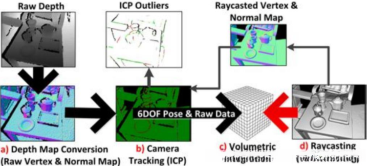 KinectFusion是首个基于RGBD相机的实时三维重建系统,用深度图像生成的点云通过ICP估计相机位姿,再依据相机位姿拼接多帧点云采,并用 TSDF模型 表达重建结果。KinectFusion虽然能实时构建三维模型,但它也存在很明显的缺点 :RGBD相机的RGB信息完全没有得到利用;为保证实时性,需要用到GPU加速,增加实现的成本;当环境主要由平行平面构成时,ICP会失败;它在对同一个环境重复建模时误差不会无限累积,但对新环境进行建模时,误差仍会累积;使用固定体积的网格模型表示重建的三维场景,因而只能重建固定大小的场景;没有使用闭环检测进行优化。
