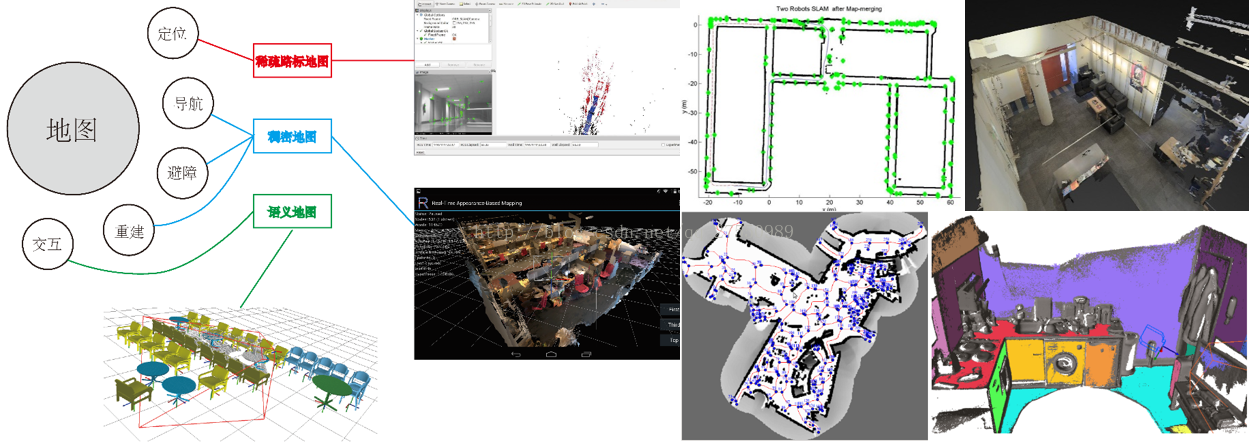 因不同的应用领域(定位、导航、避障、重建与交互)而异的地图表现形式也随之变化。这些典型的地图类别主要包括稀疏图与稠密图的结合体、基于语义的理解型图以及基于拓扑结构的知识图谱。