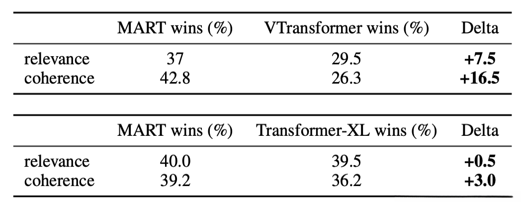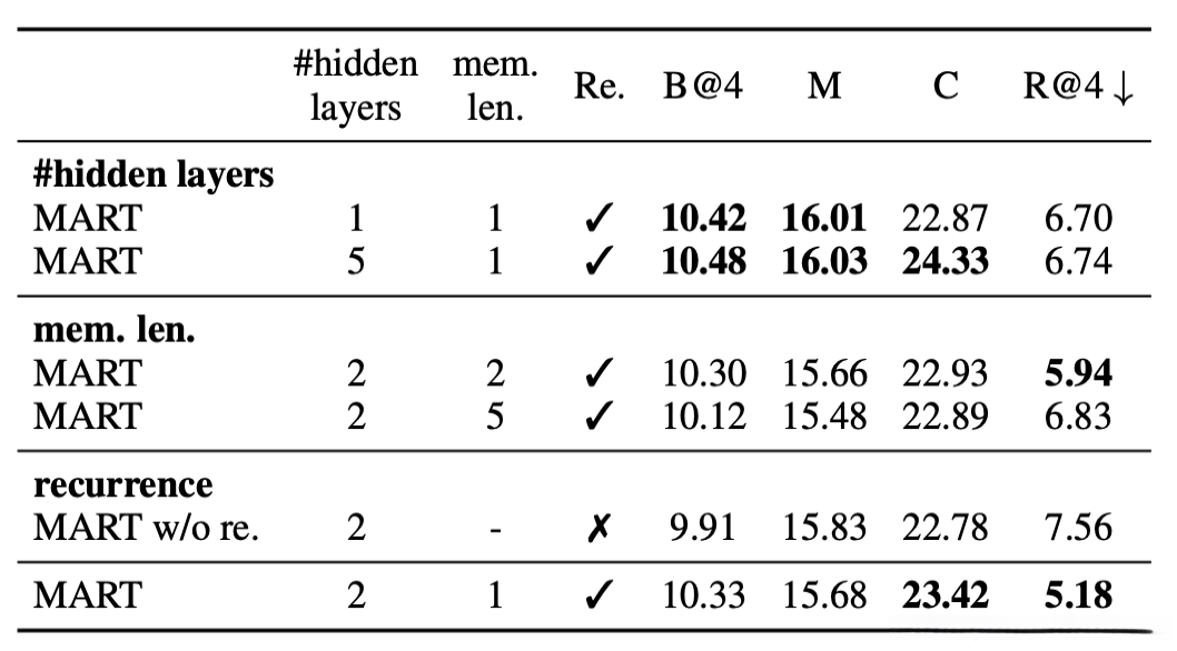 - Dai2019 (transformer-xl) 定义context fragmentation问题,认为是没有上下文视频输入因此没有长时间依赖造成的不连贯/重复,所以加了循环。与之相比,本文MART使用memory能更有效地传递语义线索给未来的句子。