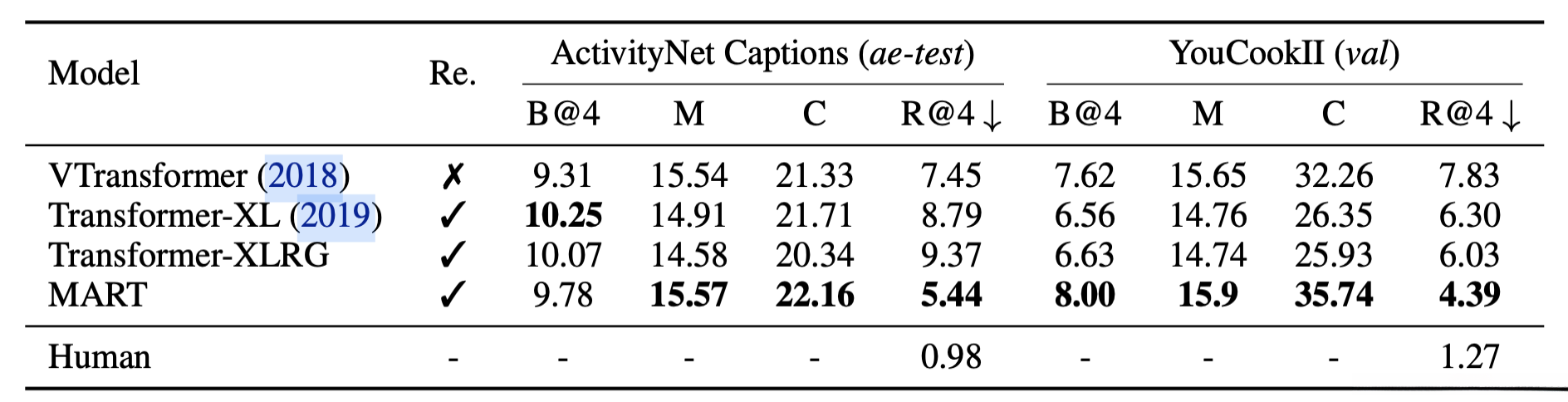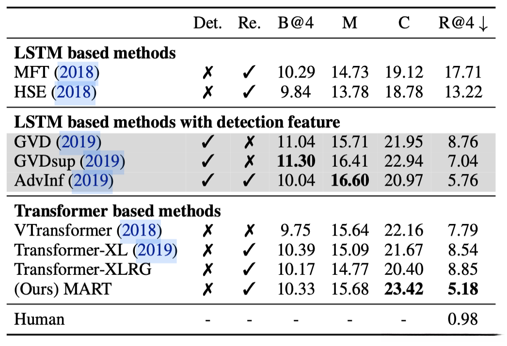 结论:transformer比lstm提升了一点性能,本文使用MART比Transformer-XL方法生成的文本更连贯、没有重复性,说明更能解决长时间依赖问题,是dense video captioning的sota。