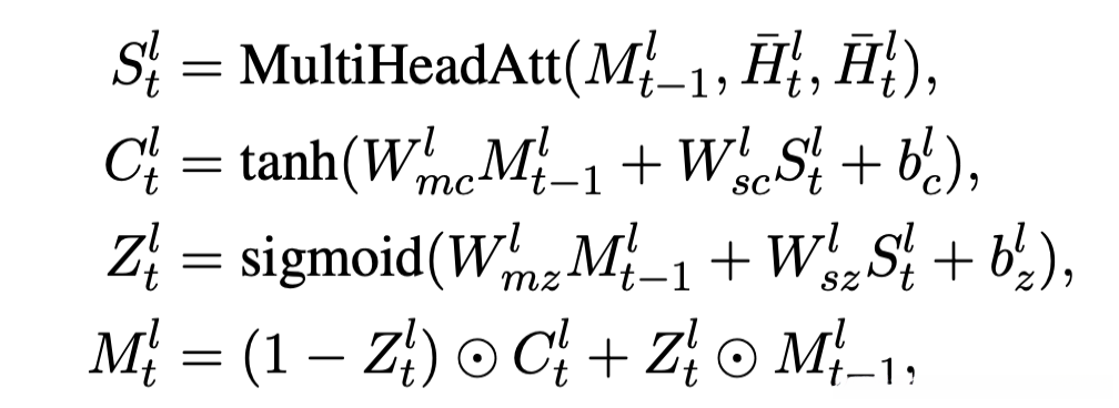 - MART:type embedding vectors表征输入token是video还是text的。position embedding只编码text token positions用于生成单词和计算loss。然后编码器和解码器是一起的,Memory Updater的公式: