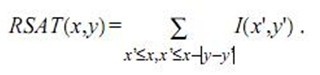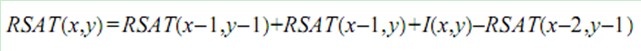 对于45°旋角的矩形,我们定义RSAT(x,y)为点(x,y)左上角45°区域和左下角45°区域的像素和。