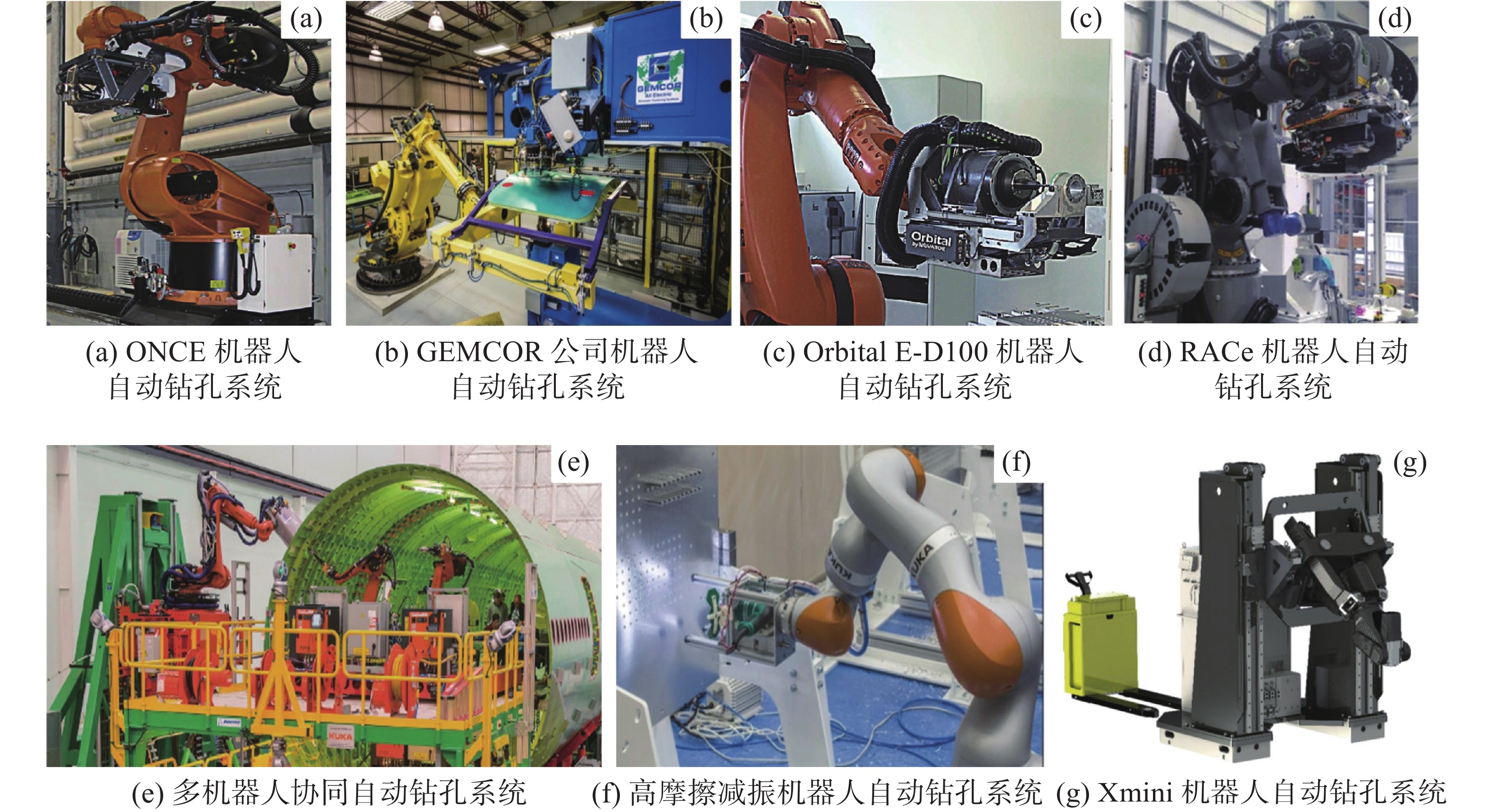 2012年,德国KUKA公司与波音公司的合作研制成功了多机器人协同钻孔系统,该系统不仅能在机舱内外实现协作作业,还能每天处理达6万个紧固件,其精确度可维持在±0.35毫米的范围内,从而确保了钻孔的高精度水平的同时,显著提升了生产效率(见图1(e))。