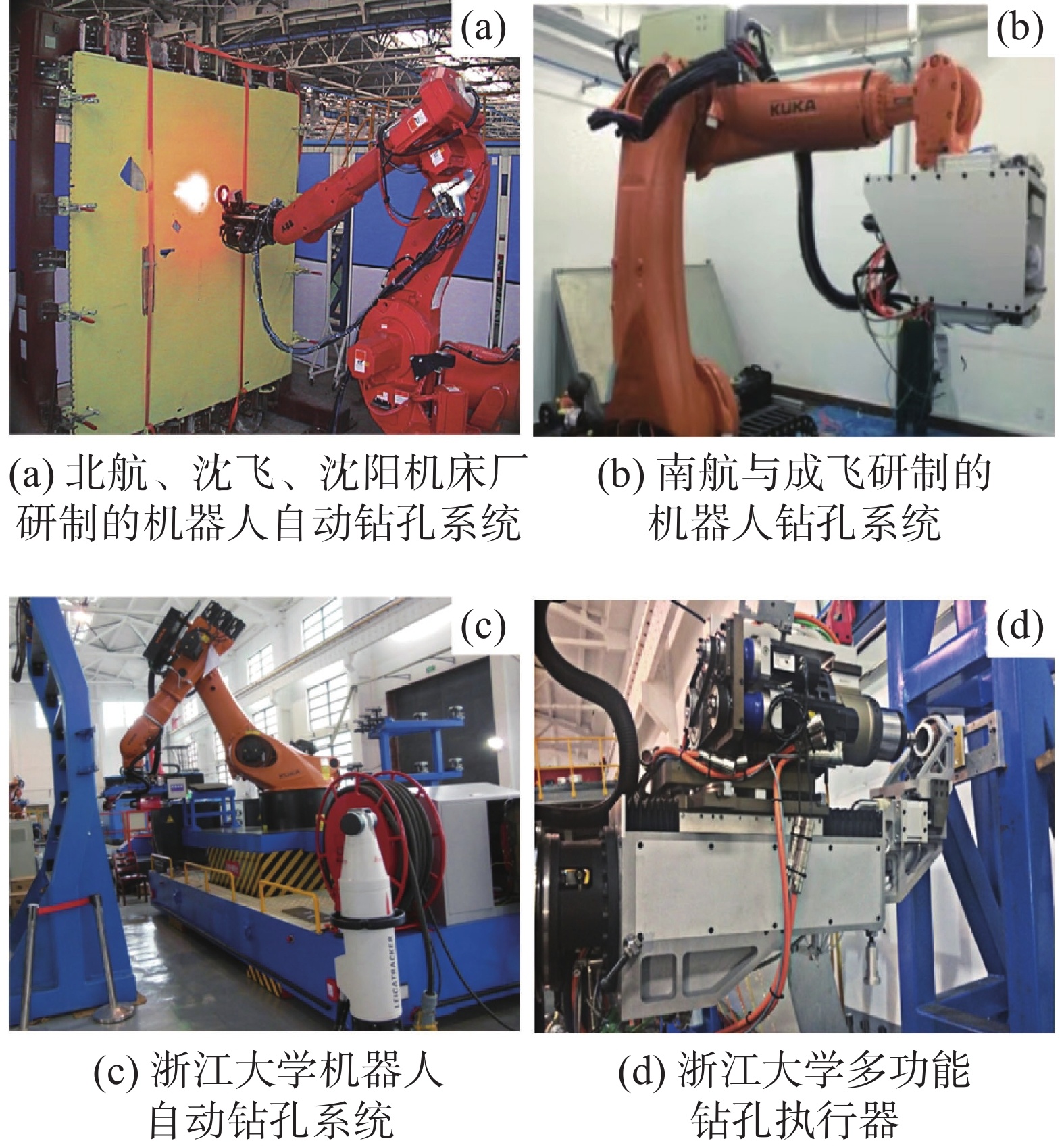 基于2007至2009年间的一次重要合作项目,北京航空航天大学联合沈飞公司及沈阳机床厂共同开发出了我国首款机器人自动钻孔设备(图2(a))。该设备具备钻孔、切槽、锪窝以及检测等功能,其钻孔精度可精确到±0.4毫米[18]。在兼顾飞机装配质量要求的前提下,该设备的工作效率显著提升,单分钟内可完成4个以上 drilling operations,且比传统人工操作可减少一半以上的作业时间[18]。尽管该系统已实现多功能型的钻孔执行装置的研发,但就其中核心技术领域而言仍存在待突破之处:包括但不限于 drilling precision compensation 和 path planning algorithms. 相比国外产品仍存在一定差距,在性能指标上尚有提升空间。