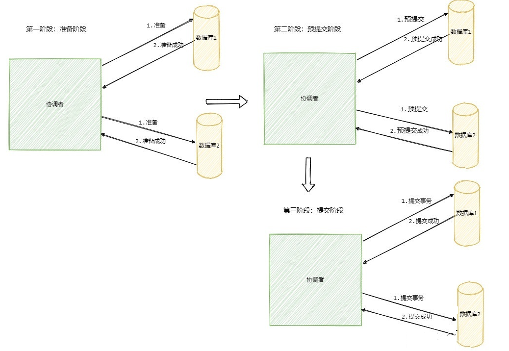 该方案通过引入参与者超时机制来实现,并通过增加预提交阶段,在故障恢复后降低了协调者决策的复杂度。然而整体交互过程变得更为漫长,并且性能表现有所下降。同样会面临数据不一致的问题。因此可以确定的是,在2PC和3PC架构中均无法实现完全的数据一致性。这也就意味着,在大多数情况下需要配置定时扫描补偿机制来解决这些问题。