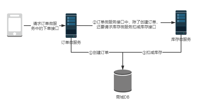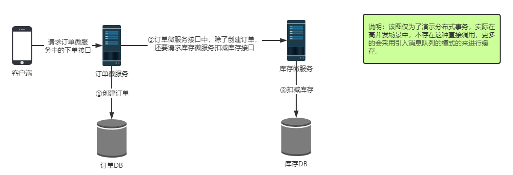 (1). 含义:在分散化的系统架构中,默认情况下不同服务之间的交互是为了实现特定的功能或目标而进行的协作过程。这被定义为分布式事务处理机制。具体而言,在下单业务流程中,首先会发起订单创建操作;随后,在确认支付成功后会触发库存数量的减少步骤