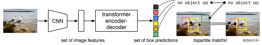 DETR(DEtection TRansformer)是由Facebook's AI Research lab于2020年提出的一种新型端到端目标检测算法。该算法采用了Transformer架构,在不依赖传统特征提取方法的情况下实现了对目标物体的高效识别与边界框定位。与经典的目标检测方法不同,DETR摒弃了传统方法中使用的锚框(Anchor Box)以及非极大值抑制(NMS)等技术,并直接利用Transformer模型进行目标框的回归与分类操作。这种创新性设计使得传统的序列预测框架得以应用于复杂的目标检测场景中