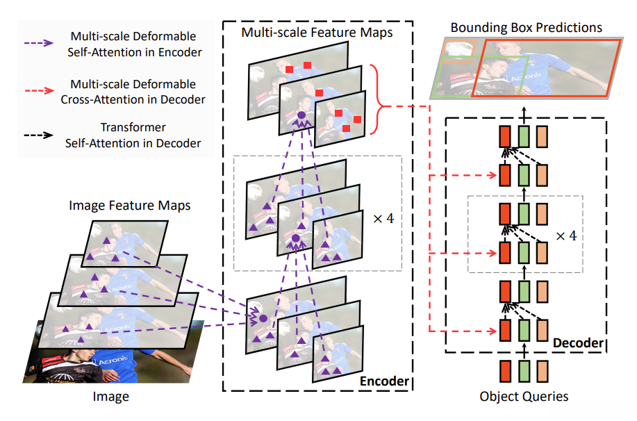 多尺度特征融合:变形可变形DETR不仅包含最终输出层的特征表示同时也涵盖了各向异性空间中的多层级特征信息并借助于多层感知机将查询信息精准地分配至不同层级的空间位置从而实现精确的目标检测与分割