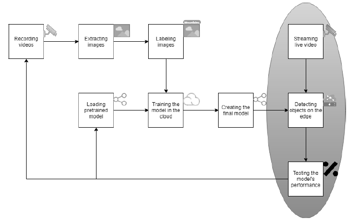 模型训练对系统资源的要求比较高,然而又由于其没有低时延要求,因此训练可以放在中心云上进行。模型的推理执行逻辑则必须放在边缘侧。模型训练过程如下: