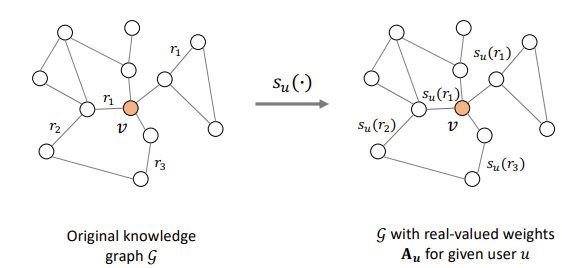 第一步:将知识图谱转化为特定用户的邻接矩阵。特定用户对关系的评分形成了一个与用户相关的评分邻接矩阵,并用数学表达式s_{u}(r)=g(\mathbf{u}, \mathbf{r})来表示这一影响程度;对于指定用户u来说,则形成了一个与该用户的特定关系评分邻接矩阵