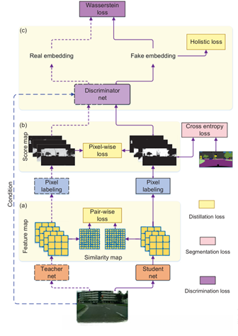 文中指出为了匹配Teacher 网络与Student网络产生的分割图的高阶关系,引入了条件生成对抗学习的思想。文中提到之前也有人用GAN来做语义分割,目标也是生成器的结果和ground truth没法被判别器区分出来。不过存在一个问题:生成器的输出是连续的(如0-1之间的某个值),而ground truth中的值是独立的(如0或1),因此判别器性能受限。而本文中的方法却没有这个问题,因为ground truth采用的是复杂网络的logits,也是连续的,和生成器的输出可以平等地比较,这是本文一个比较巧妙的点。论文使用对抗学习方法来尽量消除Teacher网络和Student网络的差异。