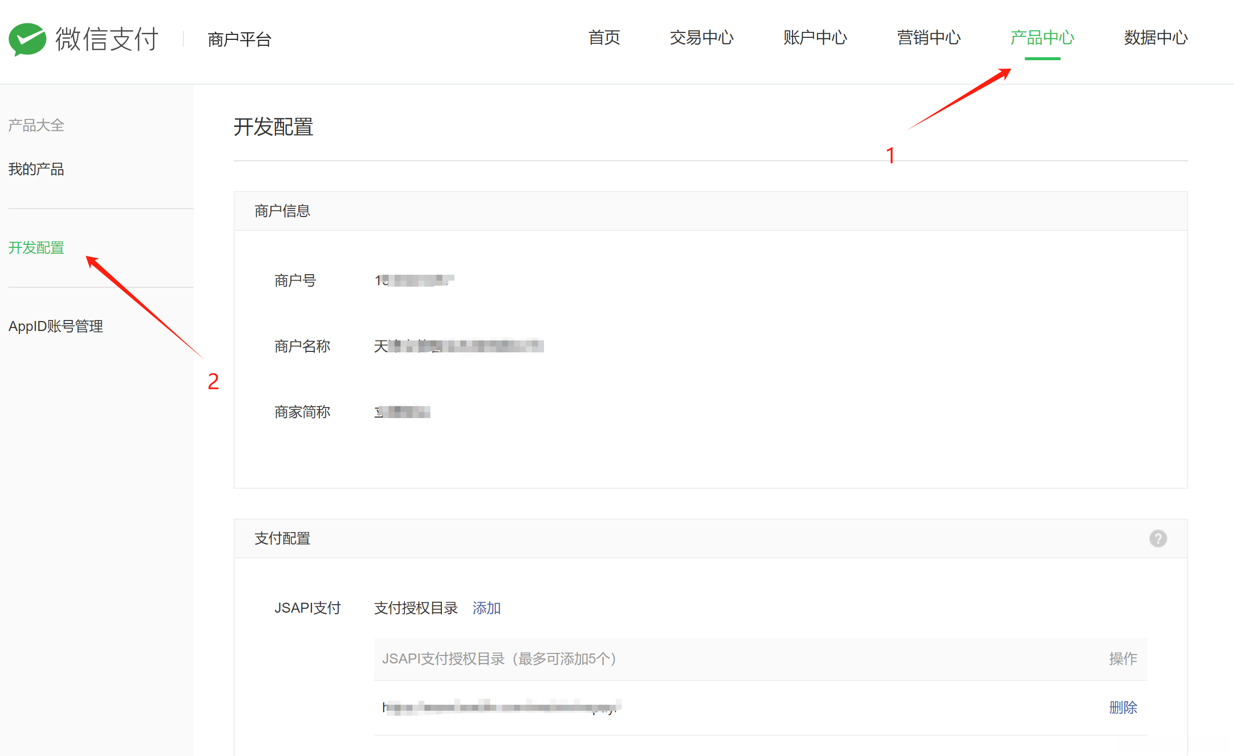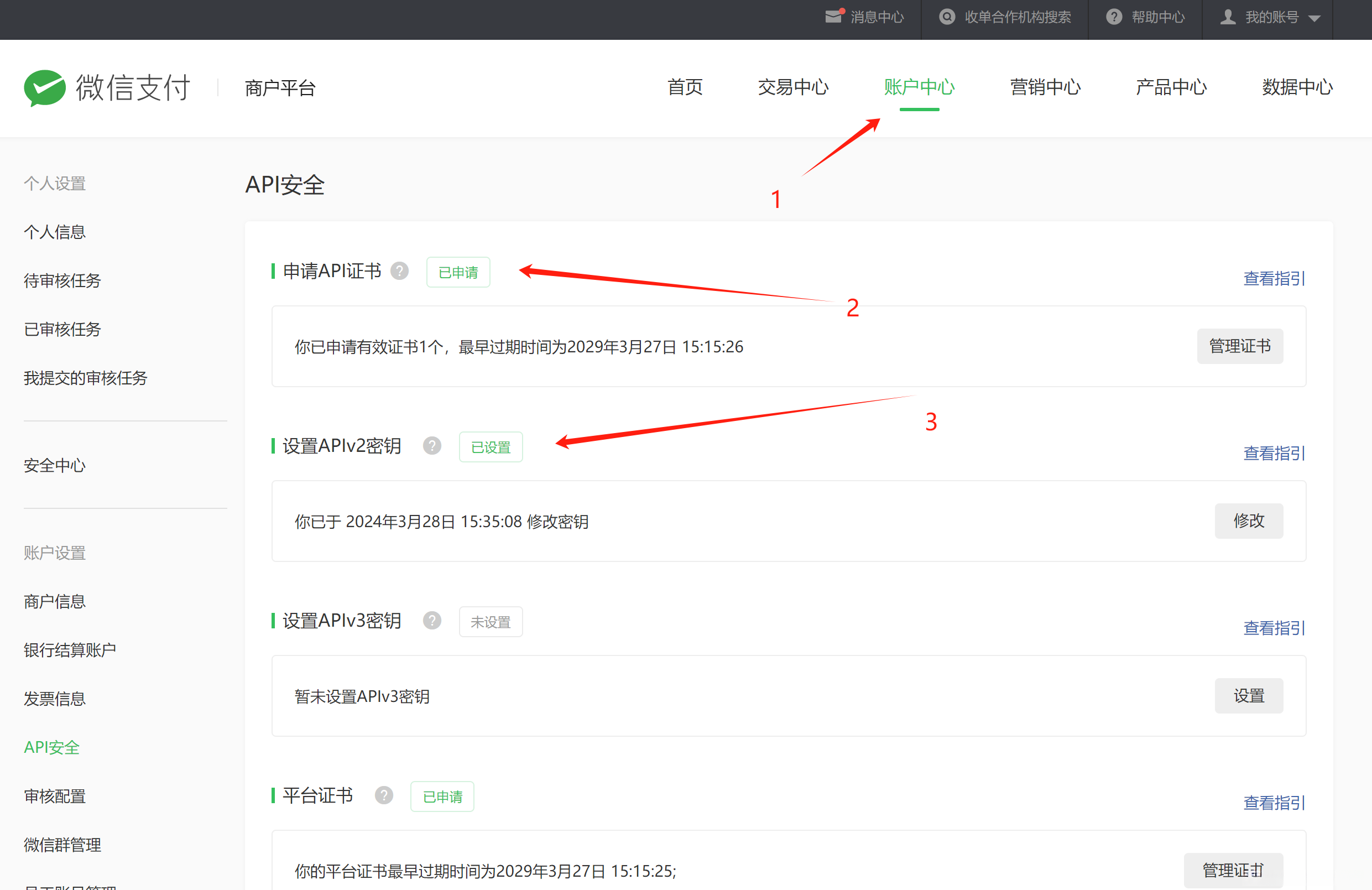 进入平台后,如下图选择帐户中心、API安全,如果没有申请API证书请申请(退款时需要使用证书),下面就是配置APIv2密钥,我们可以选择创建或修改,配置过程需要提供操作员的密码和手机认证短信。