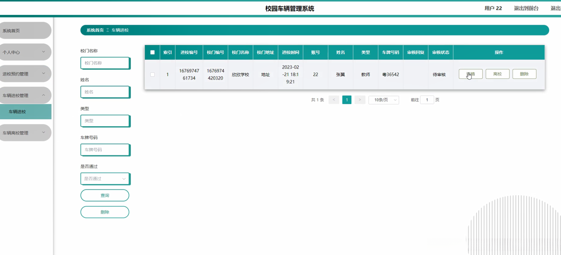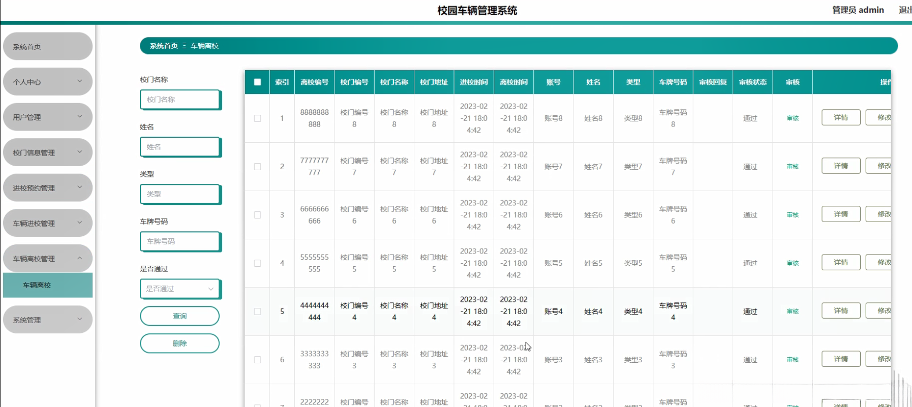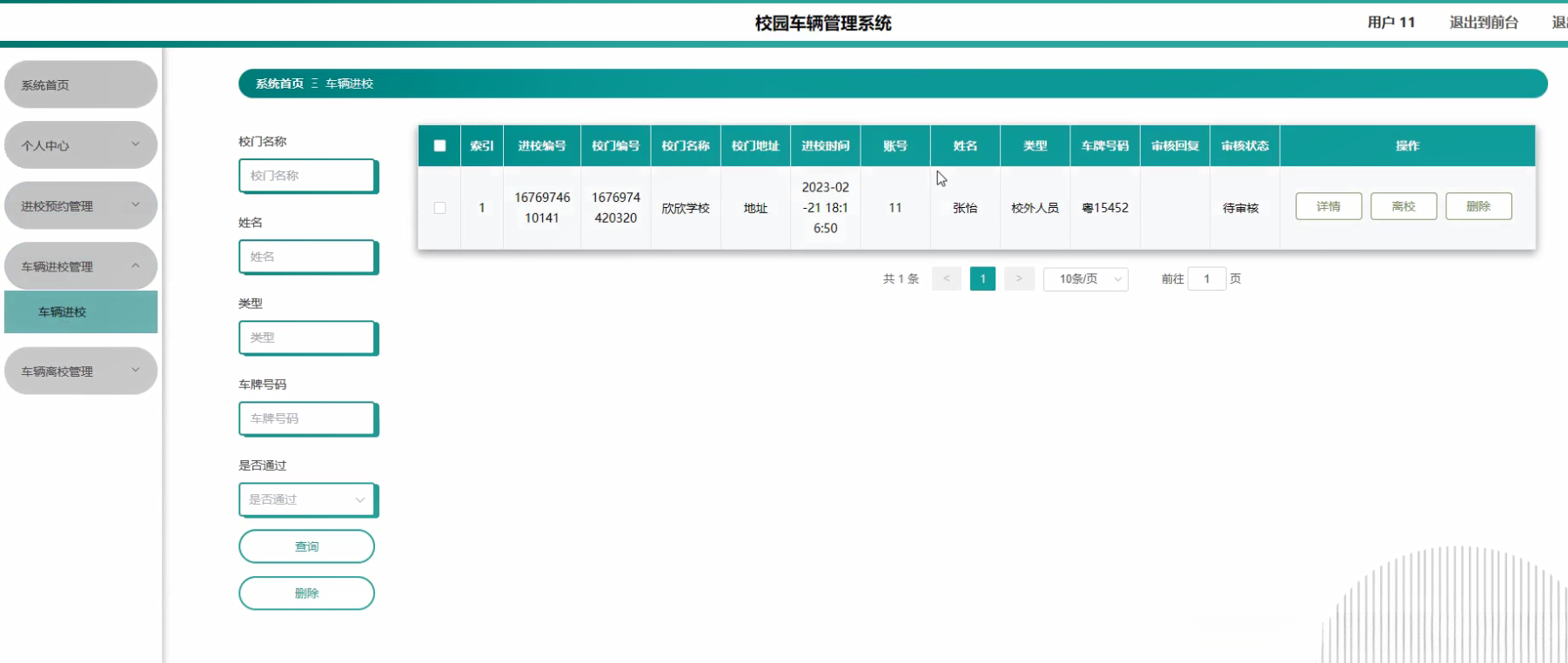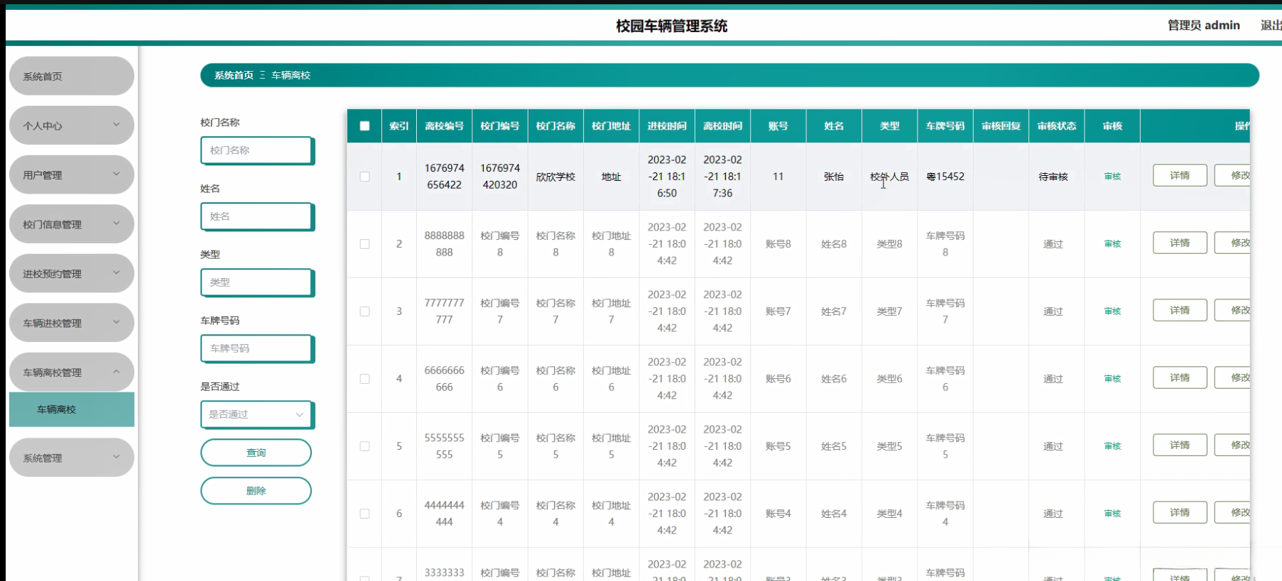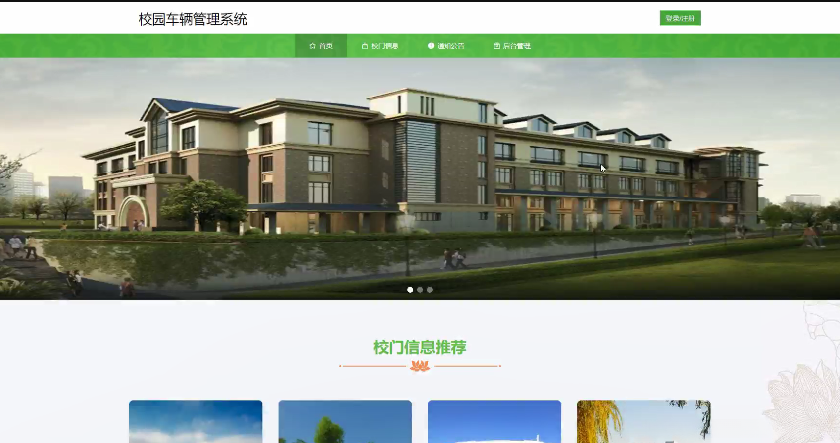本研究聚焦于校园车辆管理系统的核心功能需求设计与实现方案展开研究工作具体内容主要包括以下几个方面:首先开发用户信息管理子系统该子系统主要实现了用户注册登录权限配置等功能以满足日常校园出入管理需求;其次构建校门位置信息管理系统该系统能够实时采集并更新各类校门的基本地理坐标数据以及开闭时间等关键参数;其后设计校园出入预约管理系统该系统通过智能算法对全校师生的出入时间进行了科学调度从而有效避免了高峰期的人流拥堵问题;再次开发车辆进出记录管理系统该系统采用电子识别技术实时采集并存储每辆进出车辆的相关数据包括车牌号进园时间出园时间等重要信息;此外还构建了基于大数据分析的车辆来源地追踪系统通过对历史行驶轨迹数据的挖掘能够快速定位各类交通工具的具体出发地点从而为疫情防控提供精准的数据支撑;最后完善停车场实时管理功能通过智能识别技术实现对空闲停车位状态的有效监测并提供智能化的预约分配服务以提升整体停车效率和用户体验