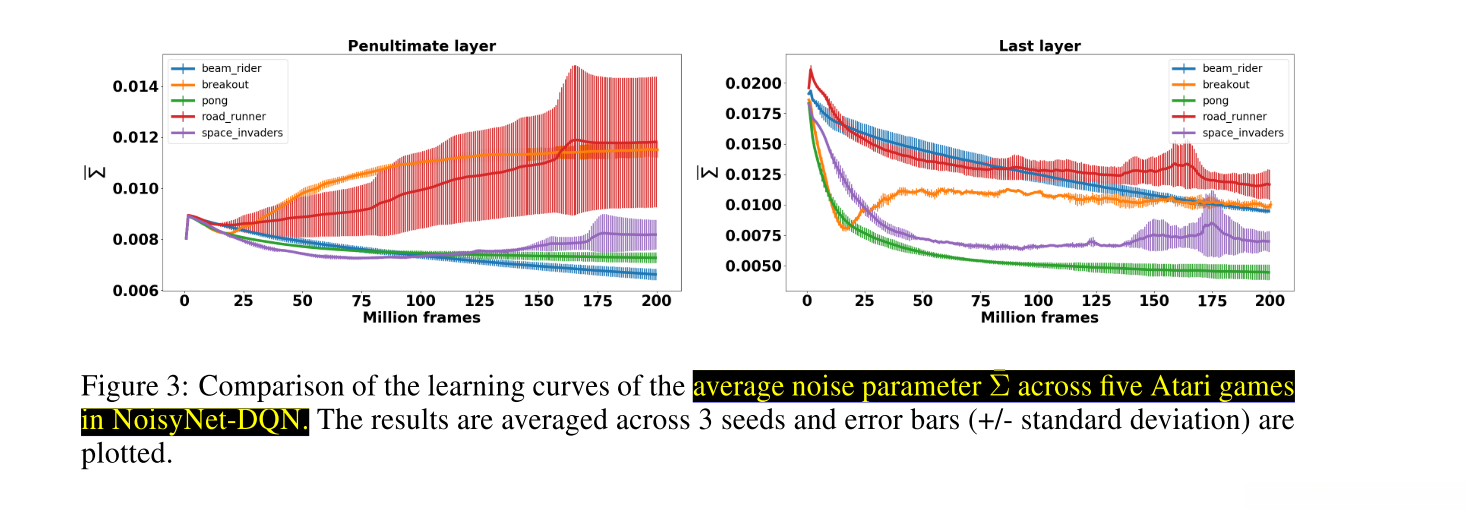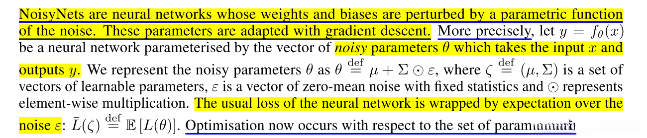 在多种任务中,噪声的大小可以通过人工调节(如DQN和A3C等通用代理中的做法)进行手动微调,也可以根据任务需求进行扩展。本文提出了一种自适应调节的方法,通过训练噪声网络来动态控制(降低或提高)神经网络参数中的噪声量。