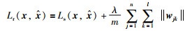 在正则化自编码网络中加入随机映射层后的优化目标函数如下式: