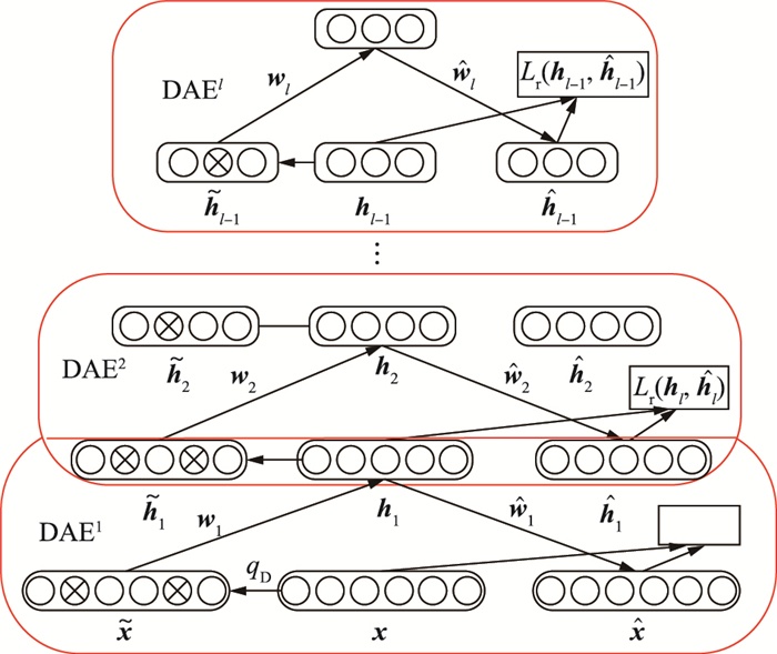 该架构整合了多组具有降噪特性的自编码器网络构建而成。其训练机制通过分阶段优化各子模型实现对主模型参数的有效更新。具体而言,在每一轮训练中,系统会依次对各个子模型进行参数调整以优化整体性能表现。以单个DAE组件的优化流程为例展开说明:首先系统会对输入数据进行预处理并去除部分噪声干扰;随后通过迭代更新逐步消除噪声干扰最终实现高质量特征的提取与重建。