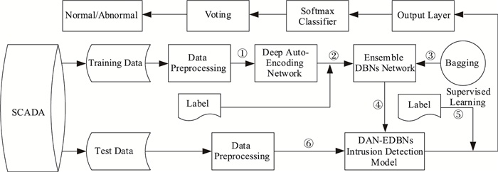 在训练过程中, 首先对从SCADA系统获取原始通信流量数据实施预处理过程, 然后将这些预处理后的特征数据导入深度自编码器网络(DAN)用于特征提取和信息降维. DAN架构包含随机映射层与去噪自编码器组件, 能够有效提升信号质量并实现潜在表征学习. 接着, 将经降维处理后标注信息的数据集构建为经验驱动贝叶斯网络(EDBNs)的学习样本集. 之后, 采用基于 Bootstrap 的 Bagging 技术对手动分类器进行样本分层划分, 通过循环迭代的方式不断优化各子网络性能, 并固定优化后的参数值用于后续构建过程. 最终完成DAE与RBM融合结构的整体搭建工作, 并利用监督学习算法对整合后的神经网络权重参数展开优化调整.
