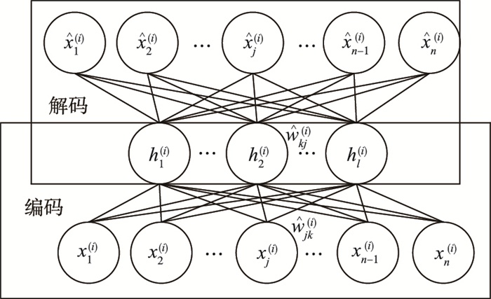 AN编码分为两个阶段:第一阶段利用编码函数将输入样本集合X = {X(1), X(2), …, X(m)} 从输入层传递到隐含层;第二阶段经激活函数作用后将其隐含层输出转化为_l_-维向量空间中的特征向量。其编码过程可用公式表示为