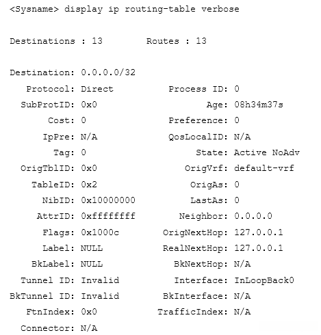 | State | 路由状态描述: · Active:有效的单播路由 · Adv:允许对外发送的路由 · Inactive:非激活路由标志 · NoAdv:不允许发布的路由 · Vrrp:VRRP产生的路由 · Nat:NAT产生的路由 · TunE:Tunnel隧道的标志 |