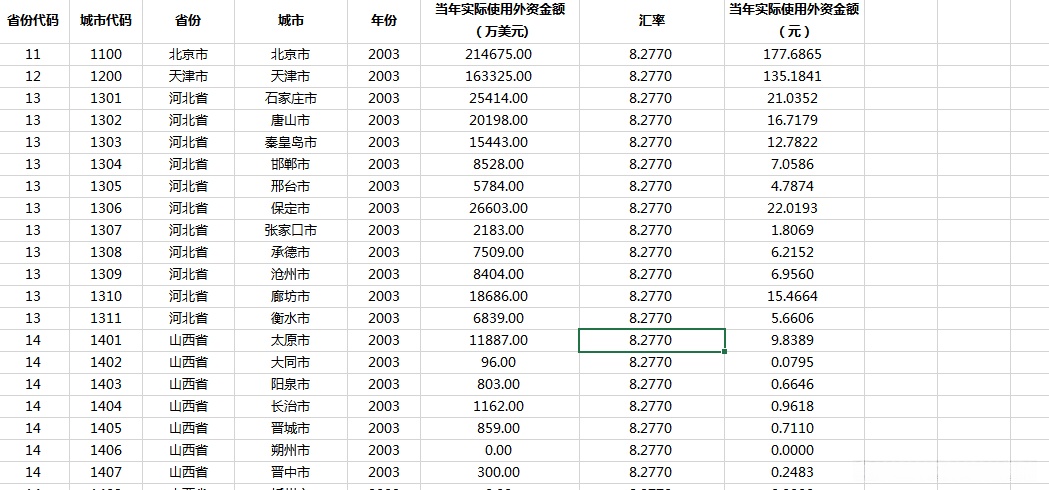 指标项目:包括省份代码标识、城市代码标识、省份名称、城市名称、年度、当年实际使用外资金额(万美元)规模、汇率水平、当年实际使用外资金额(元)数值。
