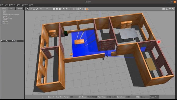 Gazebo是一个基于物理仿真的3D机器人模拟器,能够对于复杂的室内外环境精确的模拟一个或多个机器人的运动,对机器人设计、场景测试都十分有用。下图展示了Gazebo真实界面。