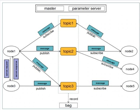 图中node1、node 2 等一共有五个节点,也就是有五个进程,一般来说一个节点来完成一个核心的功能。节点跟节点之间是通过特定的消息信息传递方式去来沟通的,也或者说是叫交互。信息传递的方式主要有主题或者话题 (topic)、服务(service)、动作(action)、参数服务器(parameter server)等。节点1和节点3之间的通信就是通过服务器的需求与响应,那对应的就是客户端向服务器发起需求,然后服务服务器向客户端去进行反馈这样的一个过程。在无人机中一些比较关键的操作是用服务来实现的。比如给无人机解锁和上锁,因为解锁和上锁就直接决定了无人机是不是要飞了。如果解锁的时候旁边有人,那可能螺旋桨一转起来就会伤到人。所以解锁和上锁是比较重要的,它是用服务来实现的,一定要有一个反馈,代表这个解锁和上锁是成功了还是失败了。话题或者主题只发布消息,消息发送之后,至于其他节点收到了没有,执行的情况怎么样,就不再关心了。发出消息后,中间像是一个话题池子(topic 1、topic2、topic 3),等待其他节点去订阅这些话题,然后就收到了这些消息了。参数服务器存储了整个计算图中的节点所需要用到的参数。ROS就通过使用节点把代码跟功能解耦,提高了系统的容错力和可维护性。在写程序的时候,最好是让每一个节点都具有单一的功能,而不是要写一个特别大的节点,这个节点把所有的事都包了。这并不是一个很好的软件开发的一个方式,因为一旦有一个程序崩溃,这整个节点就全废了,机器人肯定就会有比较严重的问题。有这么多节点,就需要有一个管理器来管理这些节点,这个就是节点管理器(master),它用于节点的名称注册和查找,也负责设置节点间的通信。