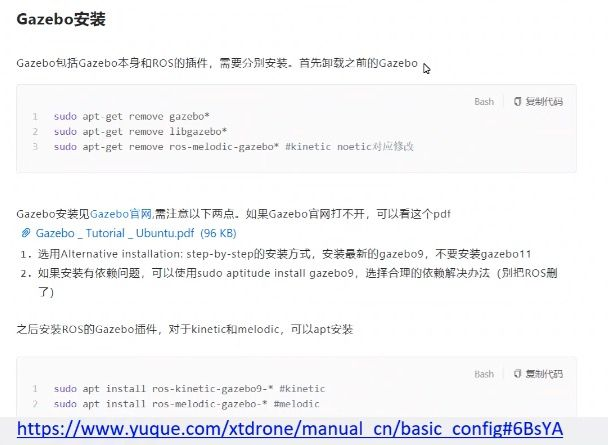 下图的链接中有详细的Gazebo安装说明。因为在装ROS的时候,它会自带的把Gazebo装上,默认装的Gazebo的版本比较低,有些地方适配性不是很好,所以要先把之前装的卸载。卸载之后,就可以按照Gazebo的官网进行安装。Gazebo安装完成后,按照链接的说明文档继续安装插件及模型文件。
