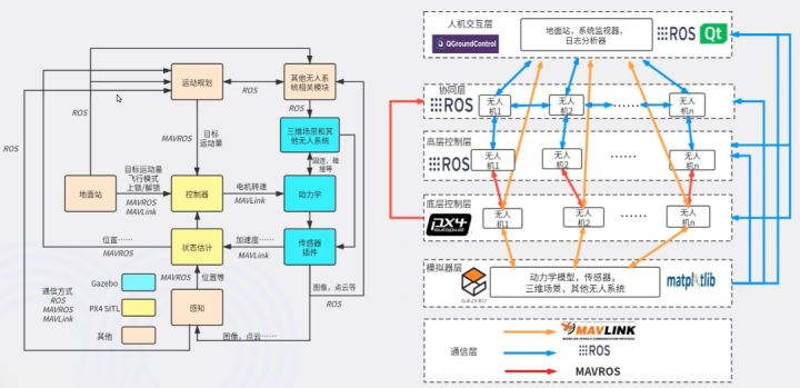 MAVROS是个比较重要的一个功能包。下图展示了真实无人机和仿真两种情况,这有助于理解ROS和PX4的关系以及MAVROS的作用。