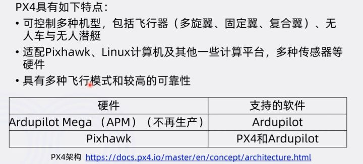 PX4的定义是一个开源自动驾驶飞行栈,简单理解它就是一个飞行控制软件。下图展示了PX4的特点。