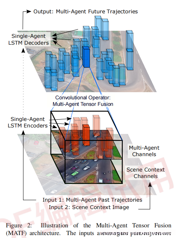 该研究者设计了一种基于多智能体张量融合(MATF)的编码解码架构。该架构以其为中心视角方法著称,并能在空间维度上保留所有智能体及其环境的空间布局信息。研究者将每个主体的历史行为进行独立编码,并将其与场景整体进行对齐处理以保证各主体及其环境的空间特征对应关系。随后利用全卷积神经网络构建了一个融合后的多主体张量并在此基础上提取各主体之间的空间交互特征。为了捕捉未来轨迹预测中的不确定性问题在模型中引入了条件生成对抗训练机制来描述有限样本集下的轨迹分布情况。