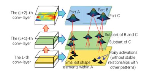 解释图中各部分模式之间的空间关系和共同激活关系。高层模式将噪声滤除并对低层模式进行解耦。从另一个层面上来说,可以将低层模式是做高层模式的组成部分。