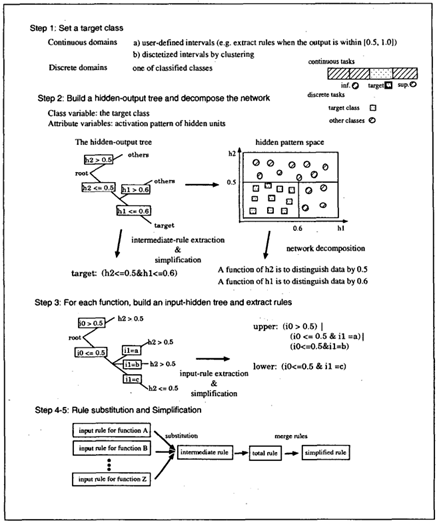 Hiroshi Tsukimoto [6]提出了一种从训练完成的神经网络中提取特征提取规则的方法,该方法属于分解法,可以适用在输出单调的神经网络中,如sigmoid函数。该方法不依赖训练算法,计算复杂度为多项式,其计算思想为:用布尔函数拟合神经网络的神经元,同时为了解决该方法导致计算复杂度指数增加的问题,将算法采用多项式表达。最后将该算法推广到连续域,提取规则采用了连续布尔函数。