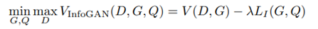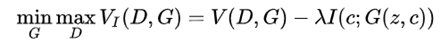 若 c 对生成数据 G(z,c)的可解释性强,则 c 与 G(z,c) 之间的交互信息较大。为了实现这一目标,作者向原始 GAN 的目标函数中加入了一个互信息正则化项,得到了如下所示的目标函数: