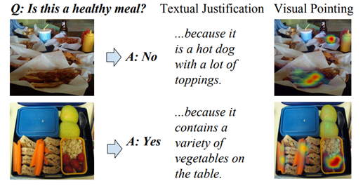 模型利用「attention」机制得到图像像素的重要性,并据此选择输出的视觉图,同时,数据集中的人类解释文本对模型的预测作出纠正,这样模型可以同时生成可视化的解释,亦能通过文字说明描述关注的原因。例如在上图中,对问题「Is this a healthy meal」,针对图片,关注到了热狗,因此回答「No」,图片的注意力热力图给出了可视化的解释,同时文本亦生成了对应的文本解释。作者认为,利用多模态的信息可以更好地帮助模型训练,同时引入人类的知识纠错有利于提高模型的可解释性。