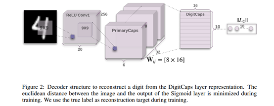 网络结构如下图所示,其中「ReLI Conv1」是常规卷积层;「PrimaryCaps」构建了32个channel的capsules,得到668的输出;「DigiCaps」对前面1152个capules进行传播与「routing」更新,输入是1152个capsules,输出是10个capules,表示10个数字类别,最后用这10个capules去做分类。