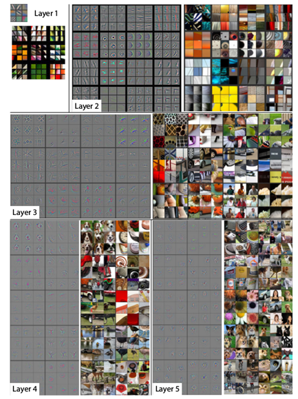 图 7:第二层学习边缘,角落信息;第三层学到了一些比较复杂的模式,网状,轮胎;第四层展示了一些比较明显的变化,但是与类别更加相关了,比如狗脸,鸟腿;第五层则看到了整个物体,比如键盘,狗。