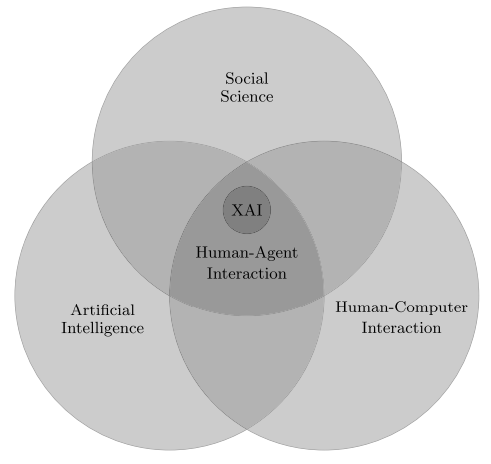 此外,我们还可以从更宏大的角度理解「可解释性人工智能」,将其作为一个「人与智能体的交互」问题。如图 1 所示,人与智能体的交互涉及人工智能、社会科学、人机交互等领域。