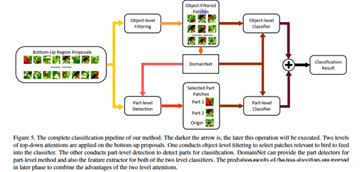 如果object很小,那么大多数的patches都是背景,因此需要top-down的方法来过滤掉这些噪声patches,选择出相关性比较高的patches。寻找前景物体和物体的部分分别采用「object-level」和「part-level」两个过程,二者由于接受的patch不同,使其功能和优势也不同。在object-level中对产生的patches选出包含基本类别对象的patch,滤掉背景。part-level分类器专门对包含有判别力的局部特征进行处理。