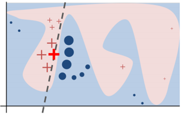 如图 2 所示,加粗的红色十字样本有待解释。从全局来看,很难判断红色十字和蓝色圆圈对于带解释样本的影响。我们可以将视野缩小到黑色虚线周围的局部范围内,在加粗红色十字样本周围对原始样本特征做一些扰动,将扰动后的采样样本作为分类模型的输入,LIME 的目标函数如下: