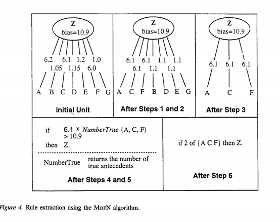 聚类采用标准聚类方法,一次组合两个相近的族进行聚类,聚类结束后对聚类的结果进行求平均处理,计算时将每组中所有链路的权重设置为每个组权重的平均值,接下来将链接权重较低的组去除,将留下的组进行单位偏差优化,优化后的组进行提取工作,通过直接将每个单元的偏差和传入权重转换成具有加权前因的规则来创建,最后对提取到的规则简化。MOFN的算法示例如下图所示。
