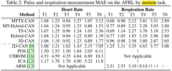 对于AFRL数据集,25名参与者被随机分为5份,每份5个参与者,使用5份数据进行五倍交叉验证,对学习模型进行训练和测试。下表1中为五份数据的结果取平均。由表1可知,我们提出的所有模型都优于2D-CAN和其他基准,而Hybrid-CAN和3D-CAN实现了与本模型类似的精度,在脉冲和呼吸测量上降低了50%的MAE和20%的MAE。TS-CAN也比2D-CAN在脉搏测量上高出43%,在呼吸测量上高出20%。我们还评估了TS-CAN和Hybrid-CAN的多任务版本,并将它们分别称为MTTS-CAN和MT-Hybrid-CAN。我们观察到,与单任务版本相比,多任务模型的不同版本并没有提高准确度,因为网络必须对两个任务使用几乎相同的参数。然而,MT模型需要的计算量和参数分别是运行脉冲和呼吸模型的一半,这是一个相当大的优势。
