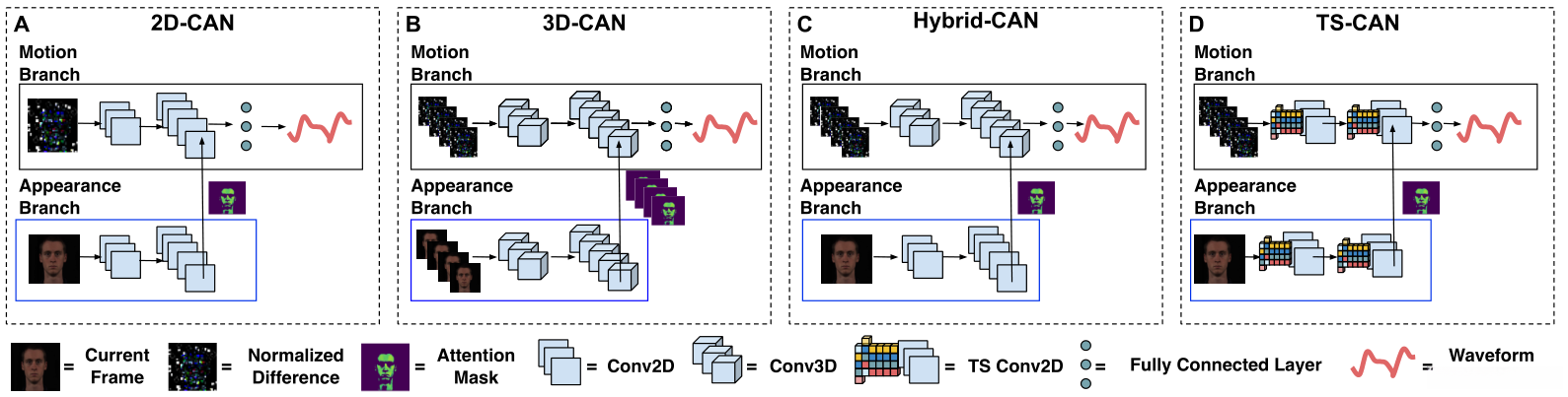我们的架构采用了带有空间注意力机制的双分支结构(见图A),其中一分支专注于运动建模而另一分支则用于提取具有意义的空间特征(如人脸区域)。然而该架构未能有效捕捉连续帧之间的时序依赖关系因而仍然容易受到噪声干扰的影响为了简化实现最直接的方式或许是引入基于3D卷积的时间建模模块即3D-CAN(见图B)。然而由于相比于2D卷积3D卷积会产生额外的计算开销因此难以维持实时性能基于此我们提出了一种Hybrid-CAN架构该方法在保留时间建模能力的同时显著提升了计算效率Hybrid-CAN通过融合2D-CAN与3D-CAN组件实现了这一目标同时尽可能地发挥了2D卷积的优势由于相邻帧之间的空间位置变化较为微小因此在外观分支中应用3D卷积的效果并不理想如图C所示外观分支的输入是由相邻N帧(窗口大小)的平均生成得到的一个单一帧输出结果尽管Hybrid-CAN较纯3D架构降低了计算复杂度但若希望在移动设备上实现至少60帧/秒的理想实时推理速度那么位于运动分支中的3D卷积所带来的额外计算负担仍然是难以承受的