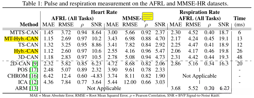 论文对所提出的方法进行了对比分析,并与四种脉搏测量技术(POS、CHROM、ICA及2D-CAN)以及两类呼吸测量手段(2D-CAN与ARM)展开了系统性比较,在基于AFRL与MMSE-HR两个标准数据集的基础上进行了实验验证