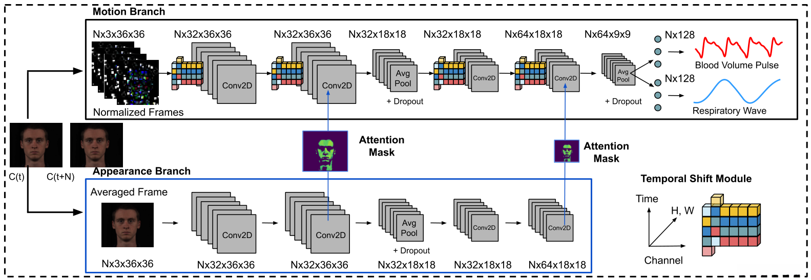 我们开发了一种新型的多任务时间偏移卷积注意力网络(MTTS-CAN),旨在解决非接触式心肺监测中的隐私性、便携性和精确度等方面的挑战。该端到端MTTS-CAN系统通过(1)引入的时间偏移模块有效建模时间信息并消除各类运动干扰;(2)采用的时间注意力机制去除噪声源的影响;(3)结合的时间联合估计方法实现脉冲与呼吸信号间的共享表示与同步解析。通过整合这三个核心技术要素,在ARM微控制器上实现了每秒超150帧的运行速度并达到最卓越的精度水平(4);从而保证了实时应用的需求。(5)在大规模基准数据集上的系统评估表明(6),我们的方法较现有方案减少了约20%至50%的数据误差率(7),且能够良好地实现跨数据集泛化能力(8)。