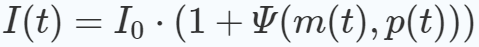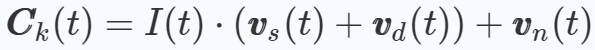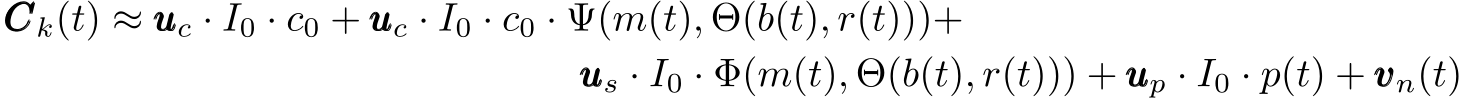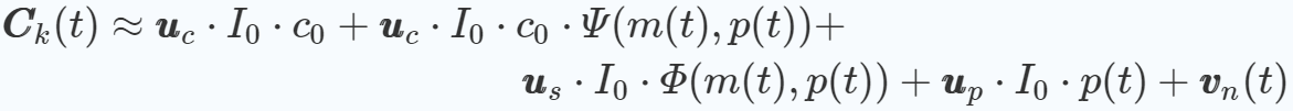 其中, 代表生理变化的变量*{p}(t)** 可以看作是由血容量脉冲*{b}(t)* 和呼吸波*{r}(t)* 组成的一个复杂结构; 因此, 我们可以将*{p}(t)* 表示为