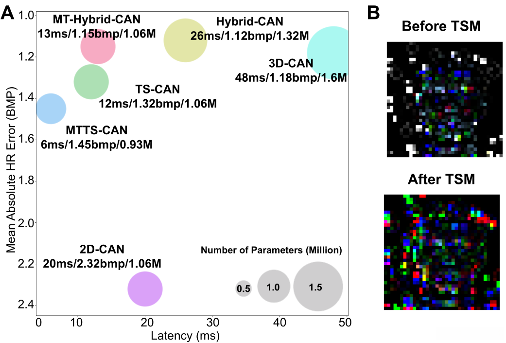 与传统的非MT模型相比,在对脉冲和呼吸速率估计误差进行比较的研究中发现,在使用多任务学习方法的情况下并未减少这些指标上的误差幅度。然而,在推理效率方面取得了显著提升(见图1),这一改进对于运行在资源受限移动平台上的设备尤为重要。为了从视频中估算出心跳和呼吸速率,在数据处理流程中采用了若干必要的预处理及后处理步骤:包括降采样图像、计算平均帧率以及识别峰值数量等关键操作。值得注意的是,在单帧推理过程中(仅需6ms时间),即便考虑预处理带来的额外开销,在实时性方面仍可维持可行性水平。此外,在内存管理方面 TS-CAN 模型展现出显著优势:仅需一半存储空间即可完整保存全部参数信息相较于 MTTS-CAN 由于其单帧推理时间仅为 6ms 因此即使加入预处理开销 在实际应用中仍能实现高效运行这一特点使得其特别适合部署在对内存极为有限的边缘设备上